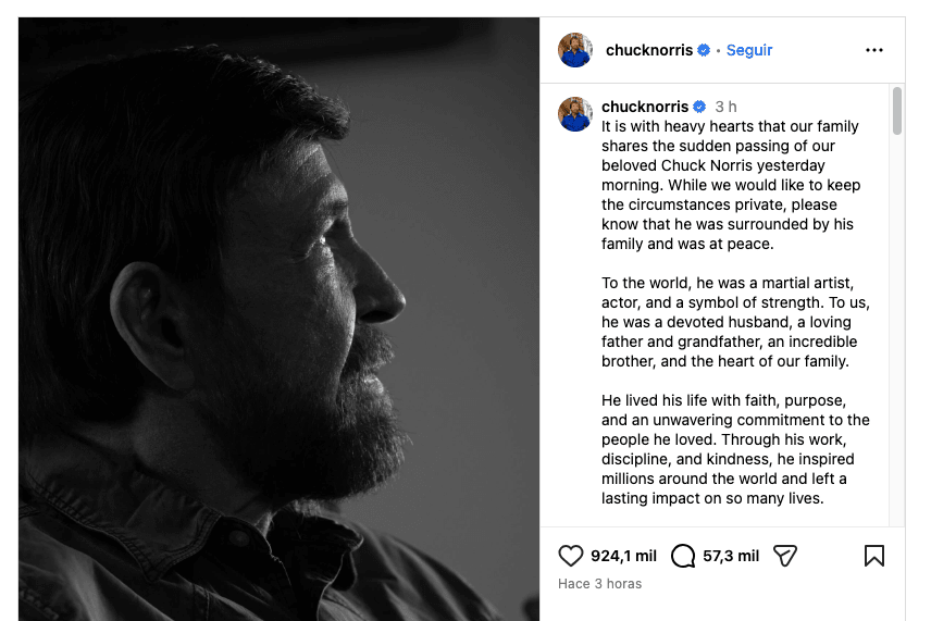 En la misma publicación, sus seres queridos detallaron que lo acompañaron hasta sus últimos minutos. Además, señalaron que, a pesar del gran iimpacto internacional de su figura pública, Carlos Ray Norris era más que un actor para su familia cercana.